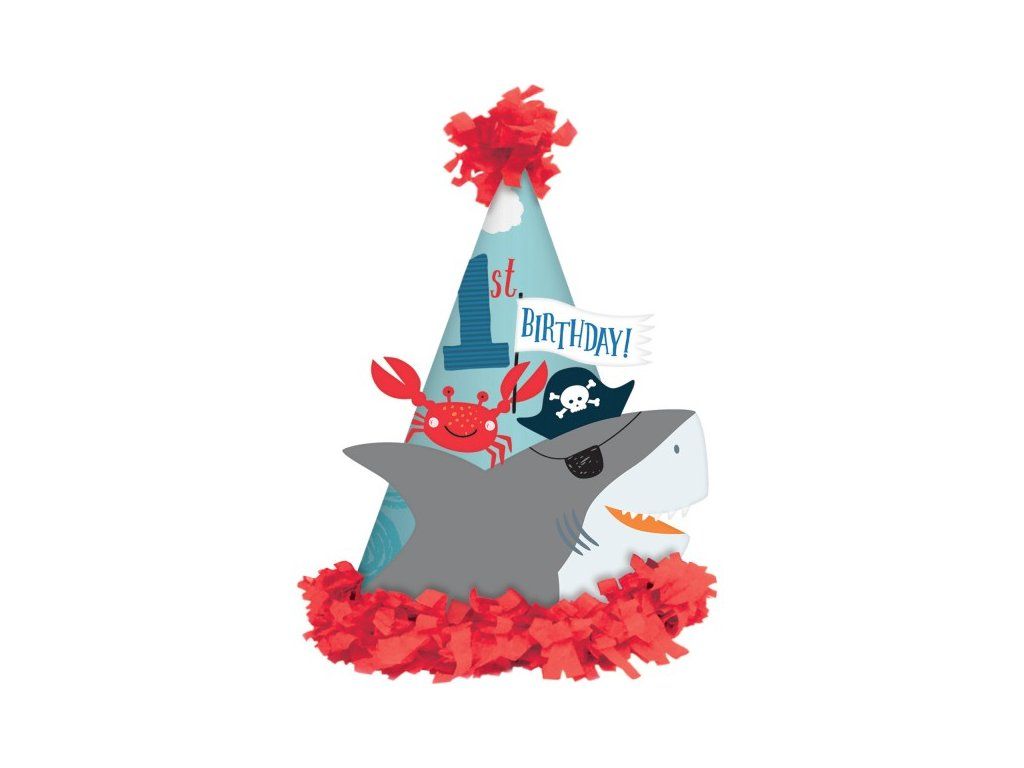 Papírová párty čepička s motivem žraloka - piráta. Výška čepičky je 17,7 cm a je opatřena gumičkou k připevnění čepičky pod bradou. Další párty čepice s jinými motivy najdete v sekci Čepičky a korunky